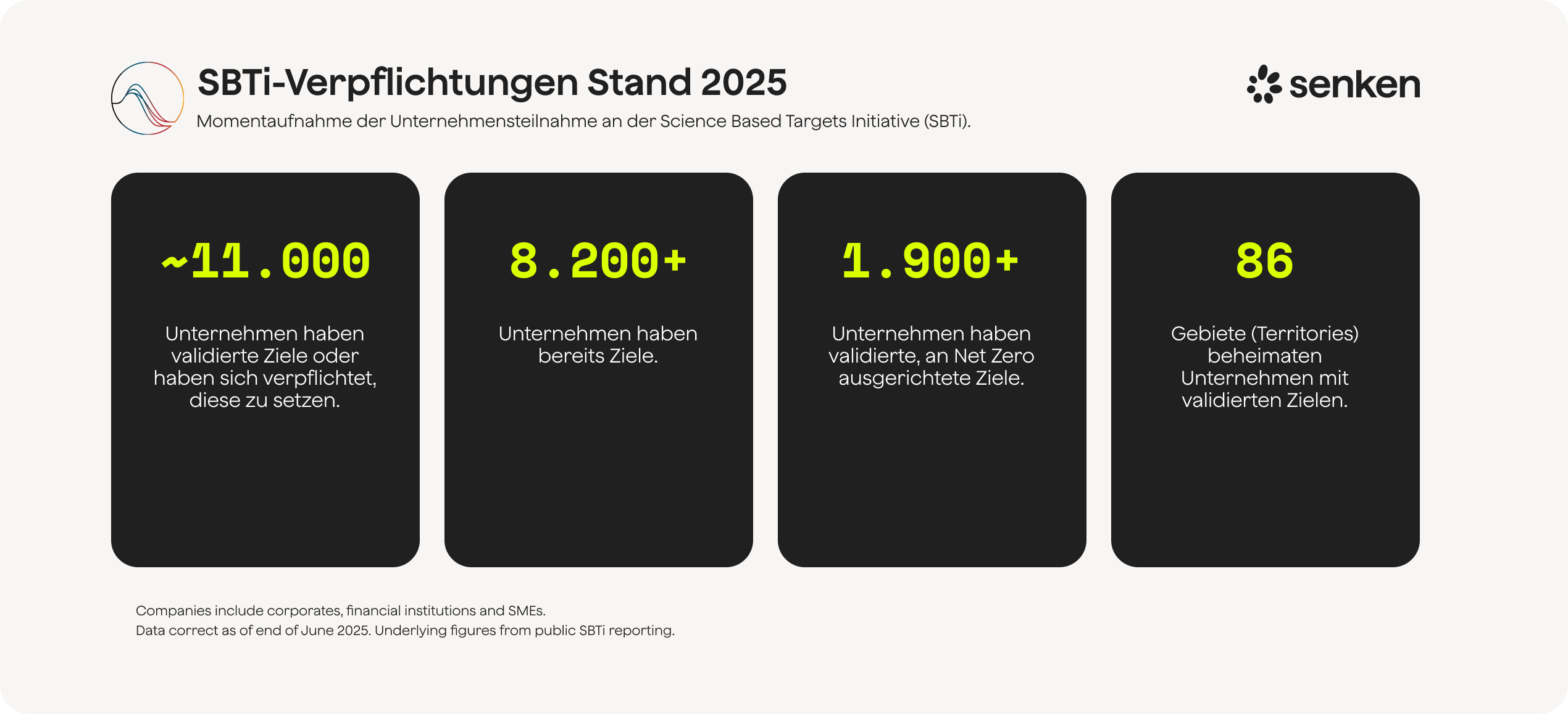 Anfang Dezember 2025 haben sich weltweit über 12.000 Unternehmen zu SBTi-Zielen verpflichtet oder diese validieren lassen, darunter 2.290 mit Net-Zero-Verpflichtungen. Das Wachstum war explosiv: Die Zahl der validierten kurzfristigen Ziele stieg zwischen Ende 2023 und Mitte 2025 um 97 %, während die Zahl der Unternehmen mit kurzfristigen und Net-Zero-Zielen im selben Zeitraum um 227 % zunahm. In der DACH-Region finden sich bereits viele validierte DAX-, ATX- und SMI-Unternehmen, von Heidelberg Materials bis Siemens.