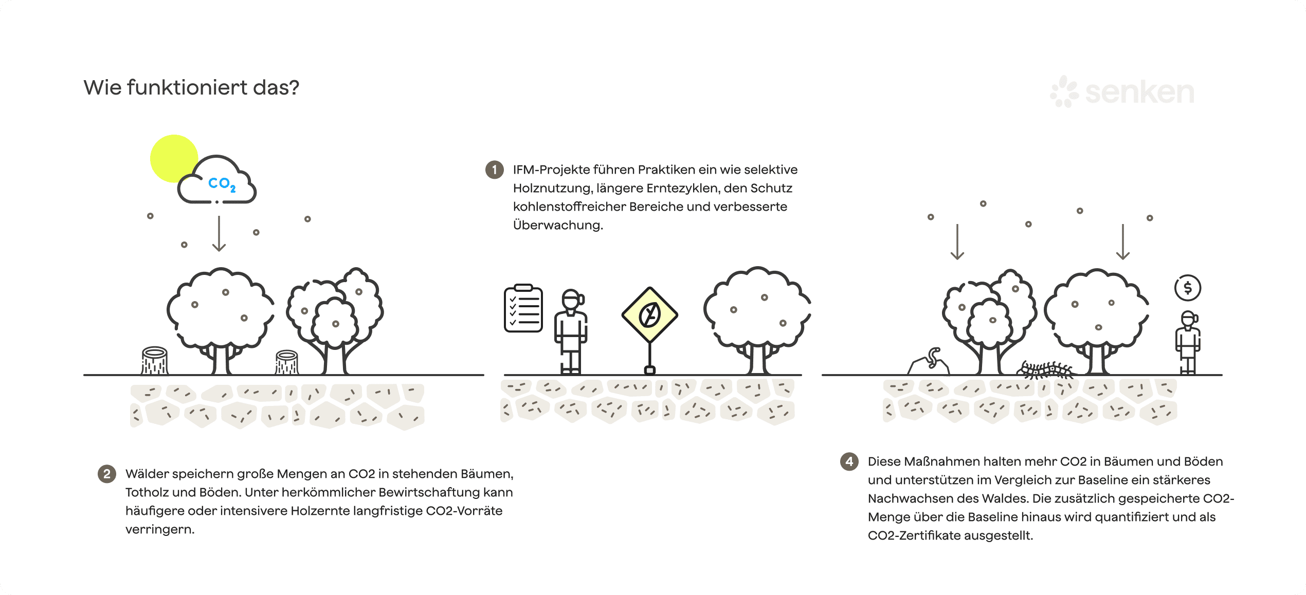 Jedes IFM-CO2-Zertifikat basiert auf einem Vergleich zweier Zukunftsszenarien für denselben Wald. Das Basisszenario stellt dar, was ohne das CO2-Projekt geschehen wäre: fortgesetzte kommerzielle Abholzung unter typischen Praktiken, rechtlichen Rahmenbedingungen und Marktbedingungen. Das Projektszenario beschreibt die verbesserte Bewirtschaftung, zu der sich das Projekt verpflichtet: längere Umtriebszeiten, schonendere Durchforstung oder dauerhafte Nutzungseinschränkungen.
