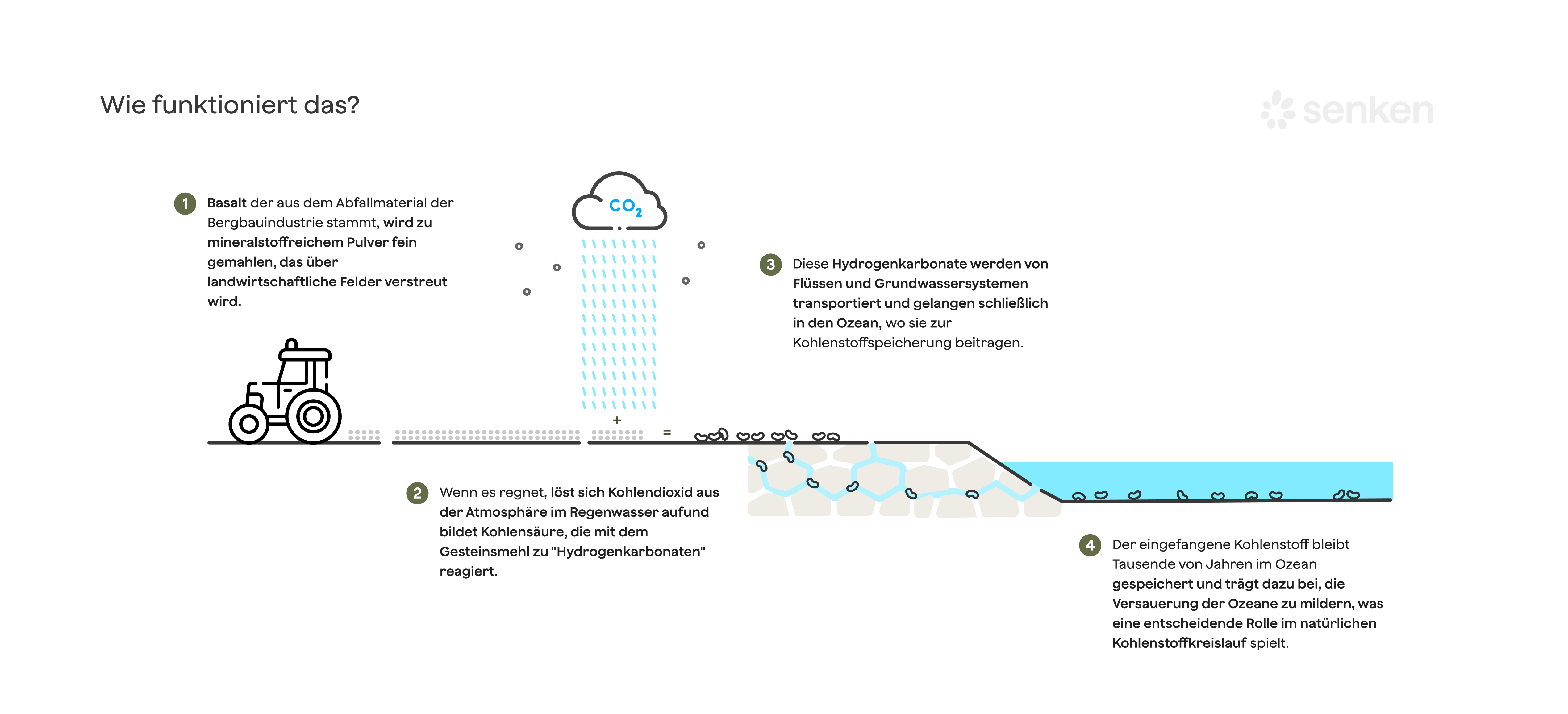 Nachdem das zerkleinerte Gestein auf Ackerland verteilt wurde, lösen Regen und Bodenfeuchtigkeit die chemische Reaktion aus. Das in diesem Wasser gelöste atmosphärische CO₂ bildet Kohlensäure, die die Silikatmineralien im Gesteinspulver angreift. Während die Mineralien zerfallen, wandeln sie das gelöste CO₂ in Bicarbonat- und Karbonat-Ionen um und setzen dabei Nährstoffe wie Kalzium und Magnesium frei, die von Pflanzen verwertet werden können.